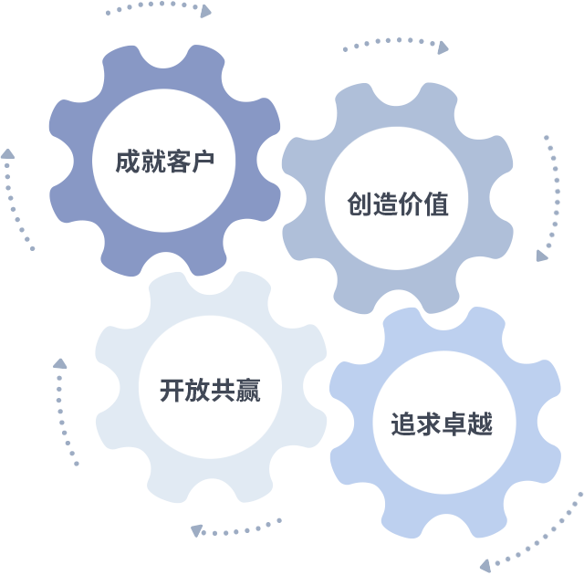 成就客户是一切决策的出发点,,,创造价值是衡量所有工作的标准,,,,追求卓越是我们做事做人的态度,,,开放共赢是我们的格局也是最终的结果。。。。价值观的齿轮环环相扣,,推动着组织里的每个人不断向前。。